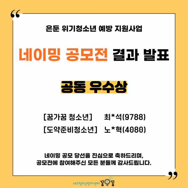 공동 우수상 시상에 [꿈가꿈청소년], [도약준비청소년] 공모작이 당선되었습니다.