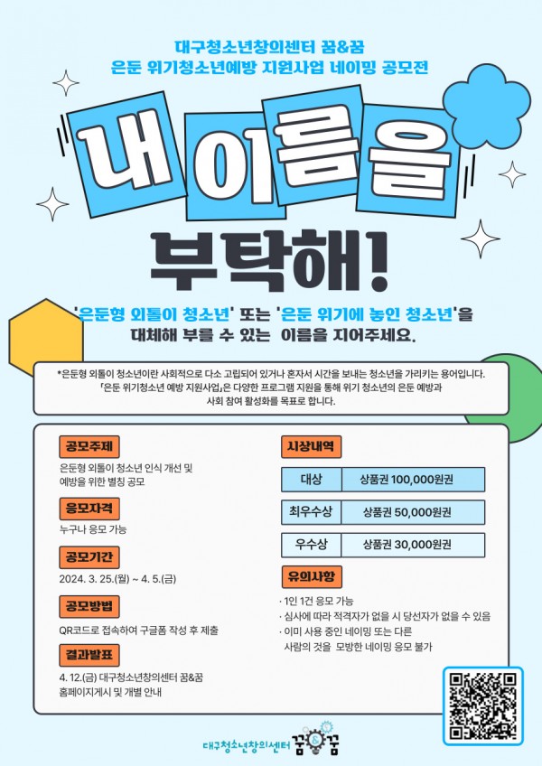 2024 은둔 위기청소년 예방 지원사업 <내 이름을 부탁해!> 네이밍 공모전 실시[종료]